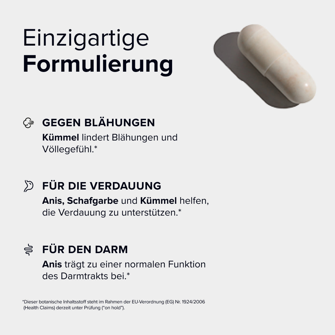 Alpha-Amylase, Protease, Cellulase, Lactase, Lipase, Inulin (Cichorium intybus, Zichorie), Überzugsmittel: Hydroxypropylmethylcellulose, Bibernellewurzel Pulver (Pimpinella saxifraga L.), Fenchelsamen Pulver (Foeniculum vulgare), Wacholderbeerenpulver (Juniperus communis), Anissamen Pulver (Pimpinella anisum L.), Schafgarbenkraut Pulver (Achillea millefolium L.), Wermutkrautpulver (Artemisia absinthium L.), Kümmelsamen Pulver (Carum carvi L.), Papain (Carica papaya L., 35.000 USP/mg)