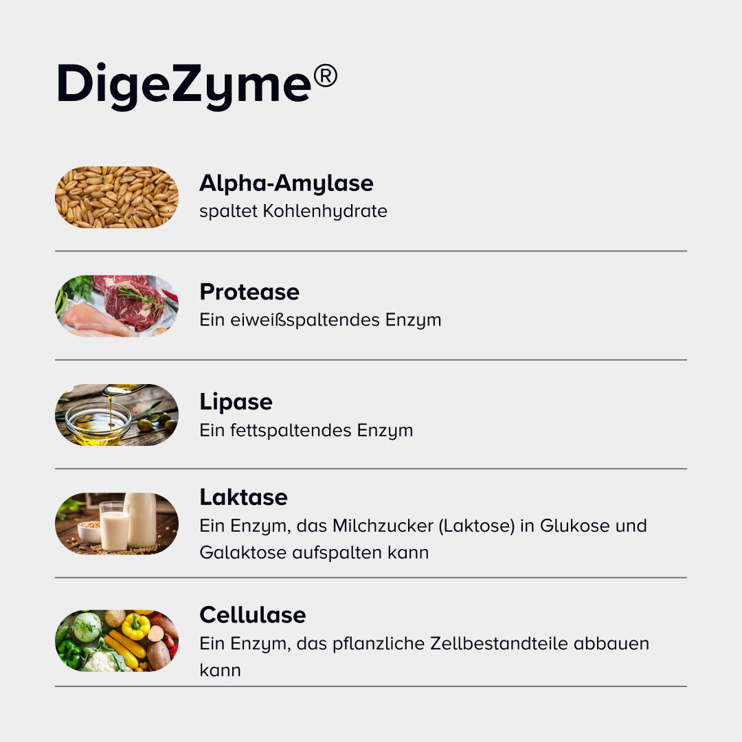 - Digezyme® Claim, weil Lactase enthalten ist: Bei Personen, die Probleme mit der Verdauung von Lactose haben, verbessert Lactase die Lactoseverdauung.