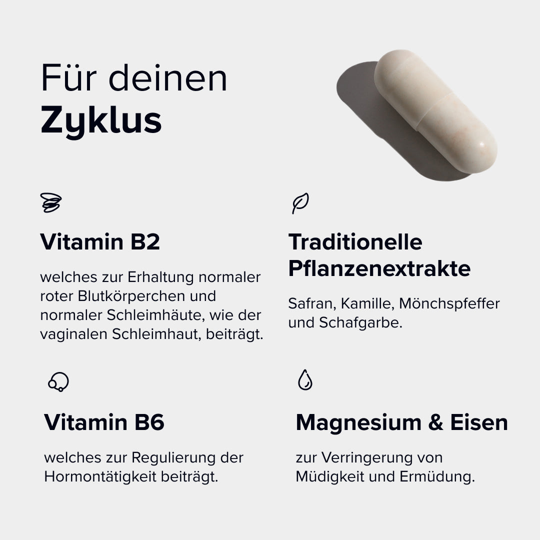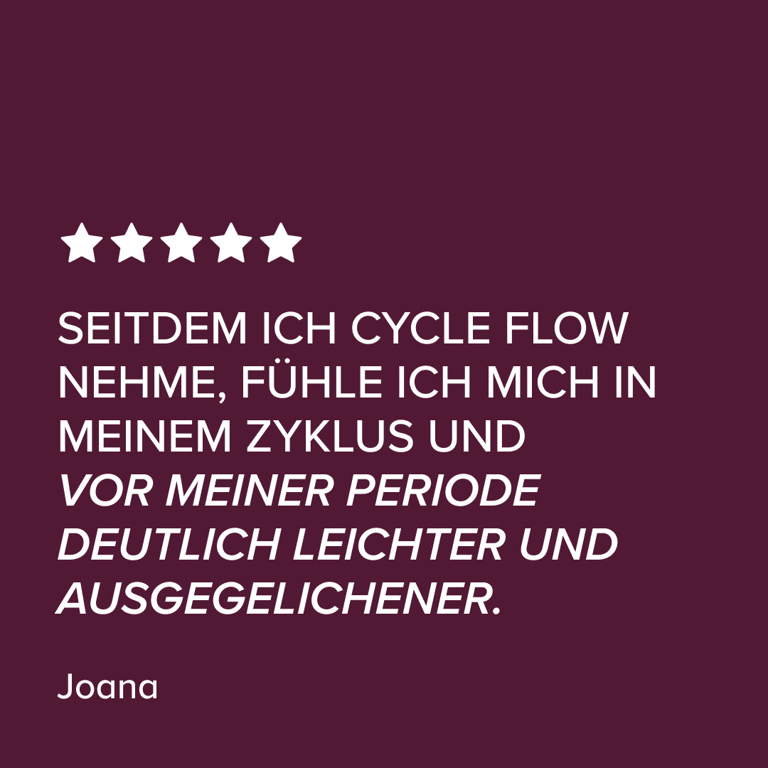 Cycle Flow – Speziell entwickelt für biologische Frauen, die prämenstruelle Symptome in der zweiten Zyklushälfte auf natürliche Weise lindern möchten. Es zielt darauf ab, häufige Beschwerden wie Krämpfe, Stimmungsschwankungen und Blähungen zu reduzieren und das hormonelle Gleichgewicht zu unterstützen.