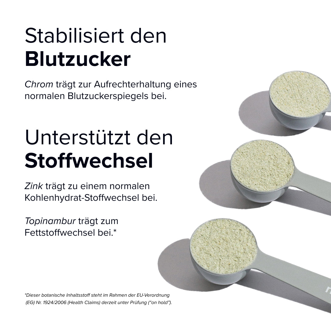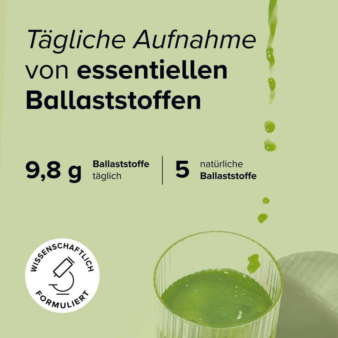 Tapiokafasern (Manihot esculenta), Ananas-Fruchtsaftpulver (Ananas comosus), Apfel-Fruchtpulver, Topinambursaftpulver (Helianthus tuberosus L., Jerusalem Artischocke, Bio), Aroma (Apfel, natürlich, 16507), Weizengraspulver (Triticum aestivum L., Bio), Gerstengraspulver, Spinatblattpulver (Spinacia oleracea L.), Zitronensäure (Säuerungsmittel), Grünkohlpulver (Brassica oleracea var. sabellica), Ingwerwurzelextrakt (Zingiber officinale L., 5:1, 5 % Gingerole), Brokkolipulver (Brassica oleracea var. italica), Chlorellapulver (Chlorella vulgaris), Meerrettichbaumpulver (Moringa oleifera), Spirulinapulver (Spirulina platensis), Brennnesselblattpulver (Urtica), Petersilienblattpulver (Petroselinum crispum), Xanthan (Verdickungsmittel, E 415), Acerolafruchtextrakt (Malpighia glabra, 25 % Vitamin C), Zinkbisglycinat (Zink), Vitamin B2 (Riboflavin), Chrom(III)-Picolinat (Chrom), Vitamin B12 (Methylcobalamin)"