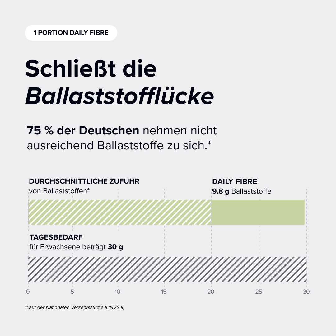 Eine Packung Daily Fibre enthält 750g. Dies entspricht einem Vorrat von 30 Portionen.